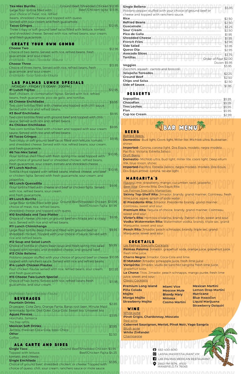 Las Palmas Mexican Restaurant Mansfield is a hidden gem located at 2860 FM157 in Mansfield, TX. Known for its vibrant ambiance, this restaurant delights diners with excellent food and attentive service. Patrons rave about the flavorful shrimp cocktail and perfectly grilled fajitas, which showcase a commitment to quality and attention to detail. The menu, while straightforward, offers a satisfying variety of traditional Mexican dishes, ensuring you get great value. Guests also commend the inviting atmosphere, whether inside or on the patio. With great margaritas and a solid selection of drinks, Las Palmas promises a memorable dining experience in every visit.